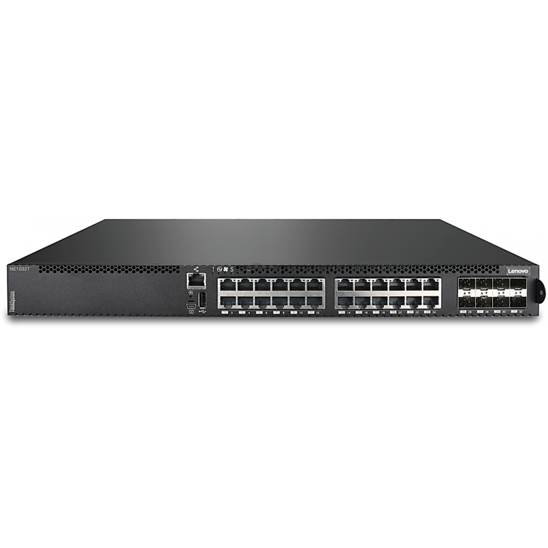 The Lenovo ThinkSystem NE1032T RackSwitch is a 1U rack-mount 10 Gb Ethernet switch that delivers lossless, low-latency performance with feature-rich design that supports virtualization, high availability, and enterprise class Layer 2 and Layer 3 functionality. The switch delivers line-rate, high-bandwidth switching, filtering, and traffic queuing without delaying data.