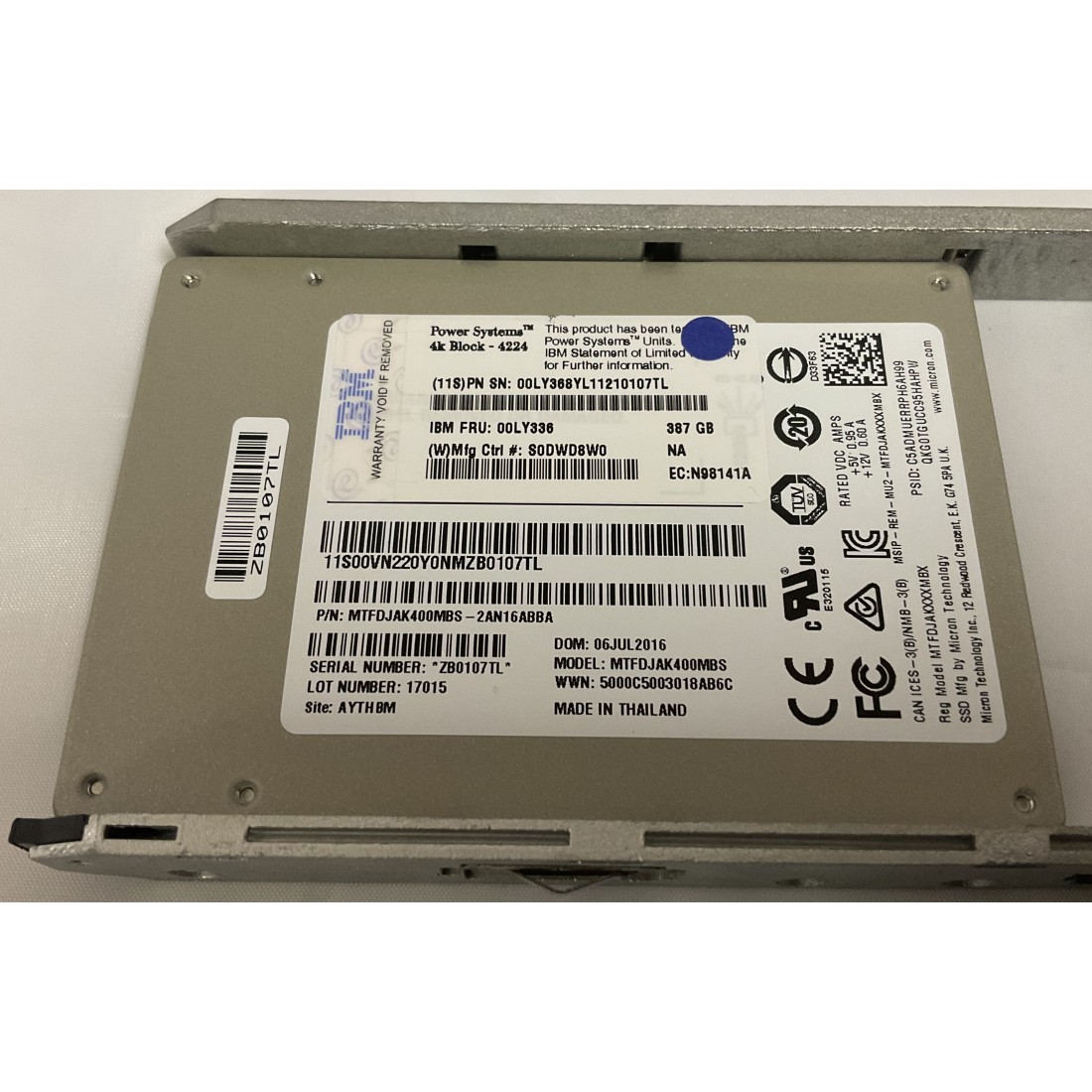 The IBM ES94 387GB 4K SAS Enterprise SSD SAS has 5B10 CCIN and 00LY336 part number, is a 2.5-Inch SAS Solid State Drive that can be installed in SFF-3 bays of a IBM Power9 and Power8 system or in SFF-2 bays of a EXP24S 5887 or EXP24SX ESLS I/O expansion drawer. The IBM 5B10 00LY336 387GB Enterprise SSD has 387 GB capacity formatted with 4k byte sectors, and can have ES94 for Power AIX, Linux Servers or VIOS, and ES95 IBM i, iSeries AS400 feature codes, depending on the OS type. The IBM ES94 and ES95 are physically identical SSDs, with the same 5B10 CCIN and may have 00LY336 00LY621 00LY368 01LU865 or 02YC567 as a part number. The ES94 and ES95 feature codes are only used by IBM configuration tools to specify which OS type for the solid state drive. The IBM 5B10 may have a ES86 ESK9 ES85 ES94 ES95 EL85 ELGB ESBA ESBB ESGC or ESK9 feature code depending the IBM Power Server Model, OS type and SAS bay placement when configured for purchase.