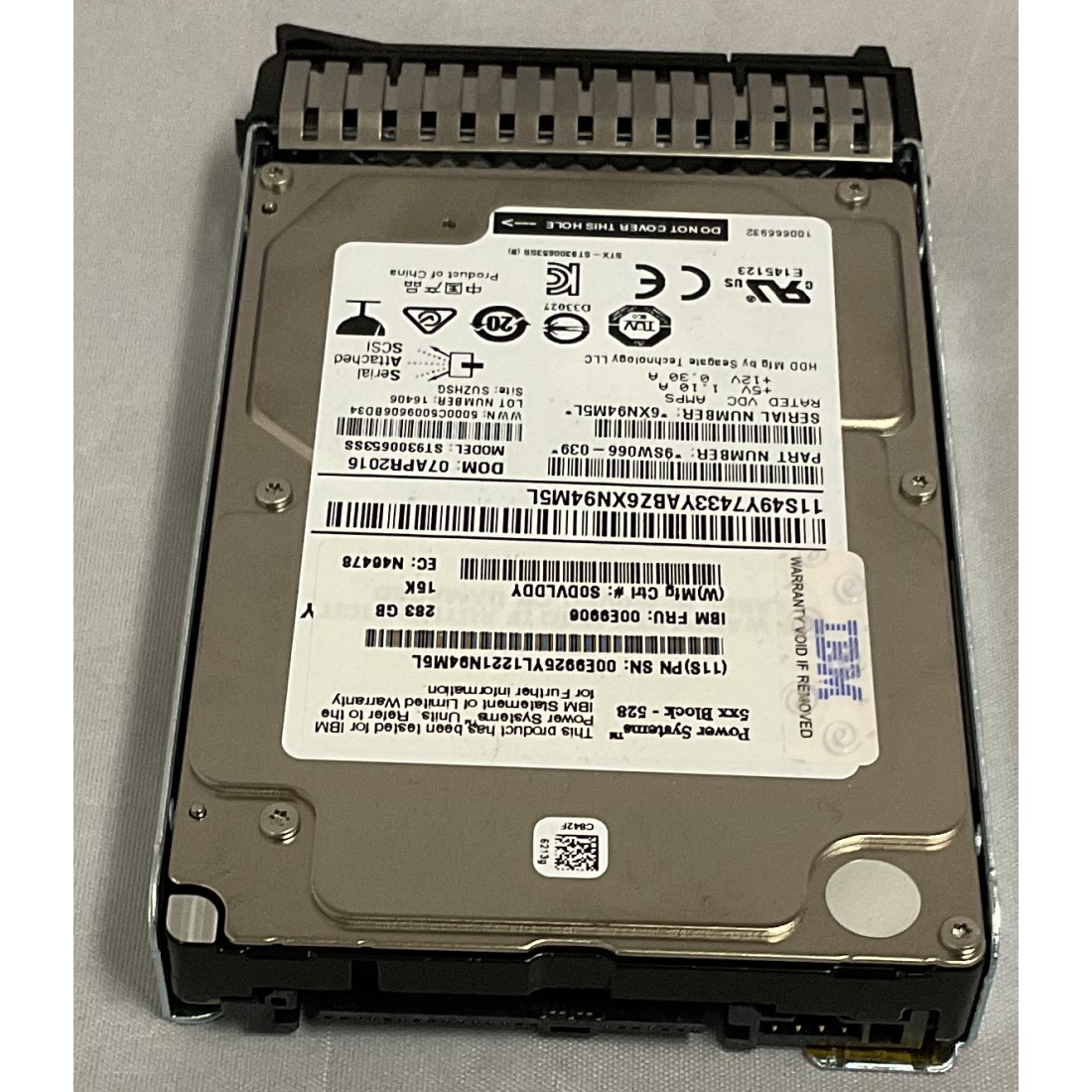 The IBM ESDA 283GB 15K RPM SAS SFF-3 Disk Drive is for IBM i iSeries systems, has IBM 59E0 CCIN and 00E9906 49Y7433 00E9926 00E9925 00E9912 00FX359 00LY500 part numbers, uses a Small Form Factor Gen-3 carrier/tray and is installed in SFF-3 SAS bays. The IBM 59E0 ESDA 283GB 15K RPM SAS SFF-3 Disk Drive is formatted for 528 byte sectors, but can be reformatted to 512 byte sectors for Power Linux systems, providing 300GB capacity. The IBM ELDB ESDA ESDB EKDB ESDV 300GB 15K RPM SAS SFF-3 Disk Drive for Power Linux systems with part numbers 00E9906 00E9912 49Y7433 00E9926 00E9925 00FX359 00LY500 is identical to the IBM ESDA disk drive and has the same 59E0 CCIN.