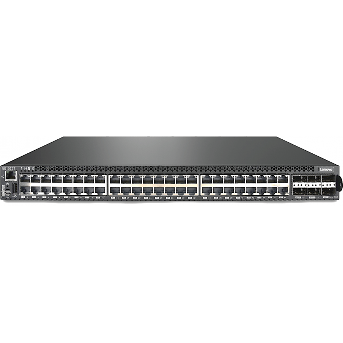 The NE1072T RackSwitch has 48x 1/10 Gb Ethernet (RJ-45) fixed ports and 6x QSFP+ ports that support 40 GbE optical transceivers, active optical cables (AOCs), and direct attach copper (DAC) cables. The QSFP+ ports can also be split out into four 10 GbE ports by using QSFP+ to 4x SFP+ DAC or active optical breakout cables.